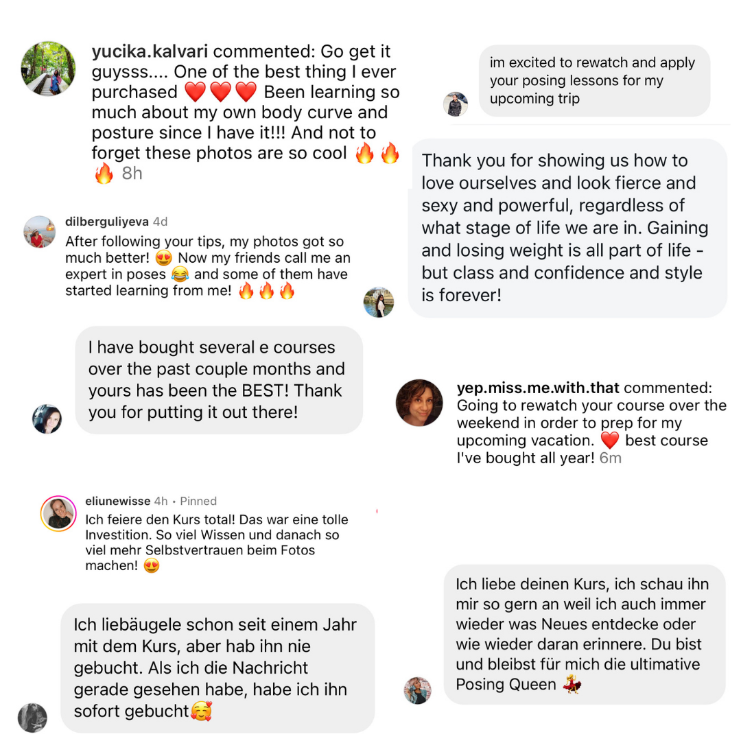 Start with my free posing guide and get an instant confidence boost in photos — you’ll know what to do with your hands, angles and posture.
