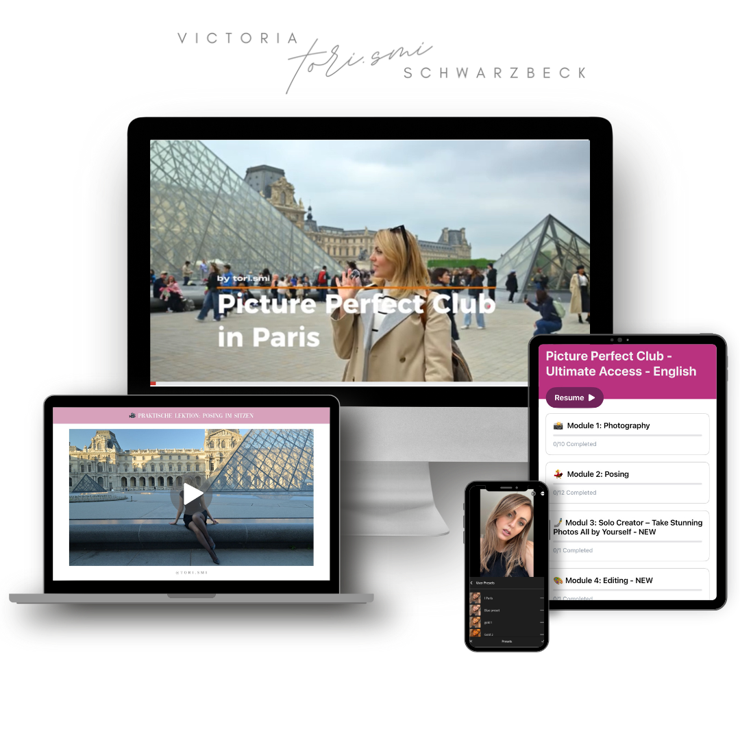 Im Picture Perfect Club lernst du die vier Fähigkeiten, die hinter jedem schönen Foto stecken: Fotografie, Posing, Bildbearbeitung und Solo-Fotografie.